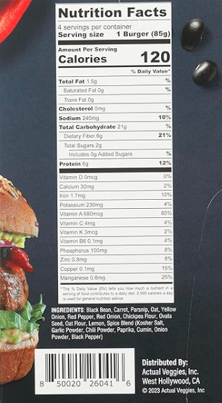 Actual Veggies Black Bean Veggie Burger – Case of 4 Packs