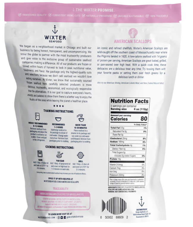 Enjoy a 12 oz bag of premium American Scallops—frozen, raw, and perfectly sized (20–30 count per pound) for quick, delicious meals. Wild-caught off the southern coast of Massachusetts, near the historic landing site of the Pilgrims, these iconic shellfish offer 14g of protein per serving and are naturally low in calories. Ideal for baking, grilling, or pan-searing, they cook in minutes and shine in pasta dishes or atop fresh greens. With enough for two in every bag, it’s an effortless way to elevate any lunch or dinner.